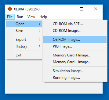 抽出したOS ROMイメージファイルを選択すれば良い.XEBRA終了時にはベースフォルダ内にOSROMというファイル名で保存され次回起動時には自動で読み込まれる.つまりXEBRA起動前であれば抽出したOS ROMイメージファイルのファイル名をOSROMにして直接ベースフォルダ内に置いても良い.